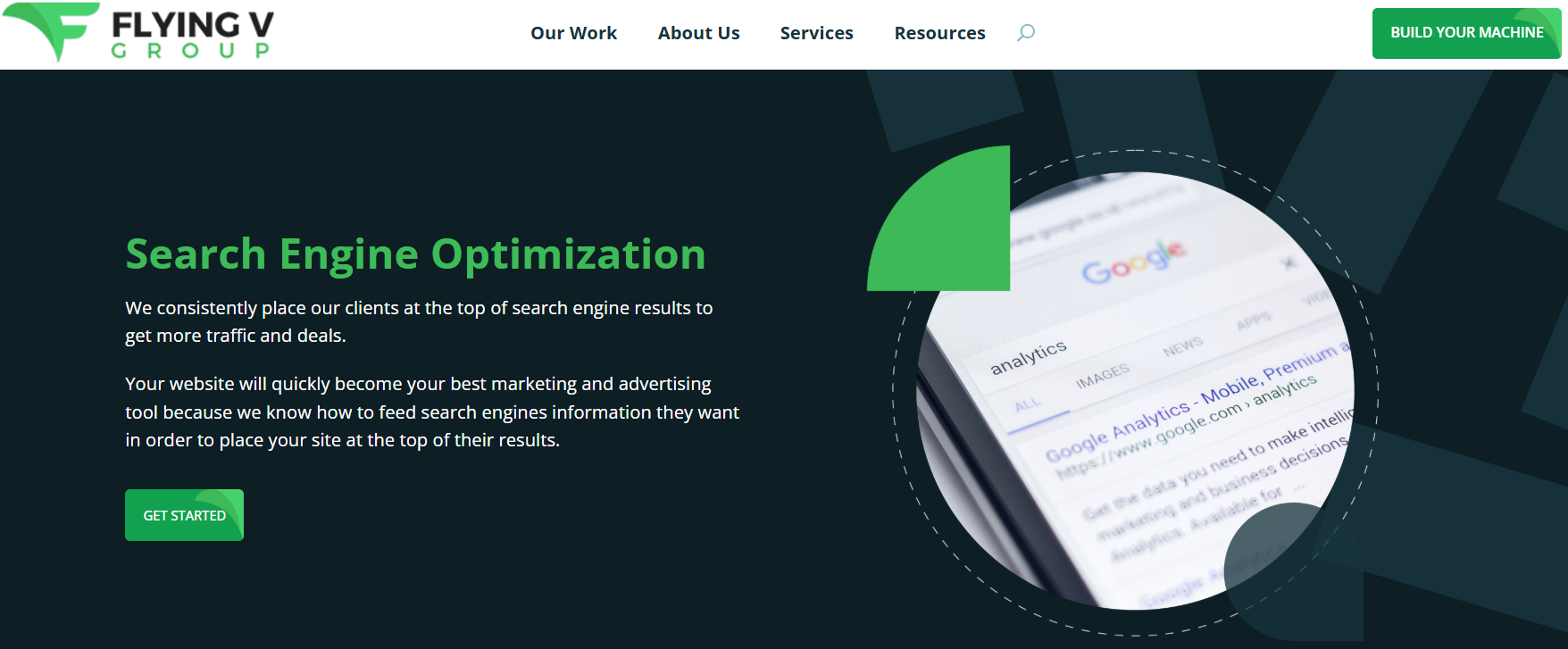 | Flying V Group | SEO, Website Funnels, Social Media | Bain Consulting, John Hancock | $5,000+ | Financial Institutions, Growth-minded Founders | 90% client retention rate, performance-based pricing options |