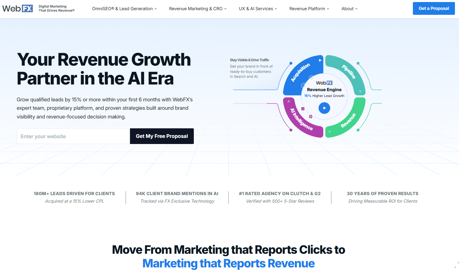 | WebFX | SEO, Content Marketing, PPC, Social Media | HydroWorx, Resource Furniture | $2,500-$8,000 | Banks, Credit Unions, Wealth Management | RevenueCloudFX tracking system, AI recommendations |